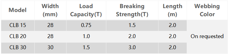 A typical car lashing system may have a webbing width of 28mm and a length ranging from 2m to 3m, with a breaking strength of 2.0T.